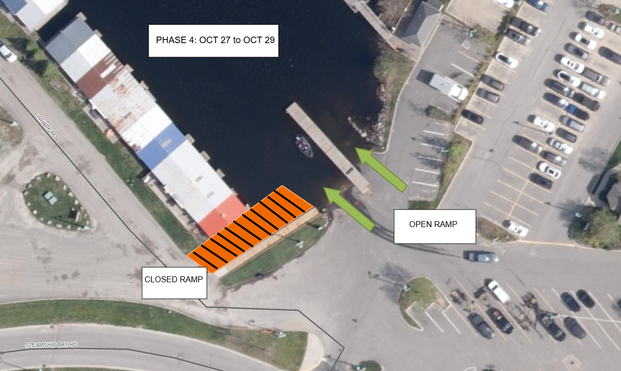 Phase 4 – The municipal Boat launch adjacent to 201 Wharf Road will be closed for a second time from Oct. 27 to 29 and during this period the east and west boat launches will remain open.