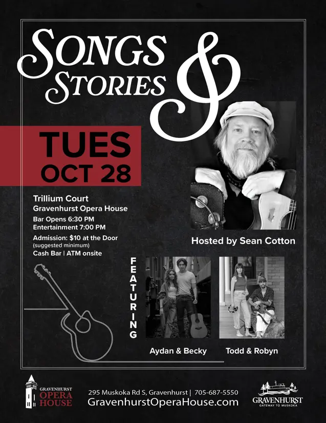 Join us in the Trillium Court Lounge for an intimate evening of stories and songs hosted by Muskoka musician, singer and songwriter, Sean Cotton. This monthly meeting of the musical minds is always an enjoyable experience for the audience and the talent alike. No two evenings are the same. The stories are always fascinating and the music that flows back and forth between the artists is always a delight.