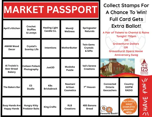 Join us for a lively open-door anniversary market celebrating 125 years of music, memories, and community spirit! Explore locally made art, crafts, and delicious treats, and take in the magic of Muskoka’s creative heart—inside and outside the Opera House—with Country 102FM LIVE on location, family fun through the library and through COG (Connected Ontario Geocachers), and our community pride on full display. It’s the perfect way to celebrate a century and a quarter of Muskoka magic!