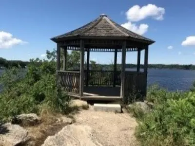 The gazebo is located in a secluded area, it is a peaceful place to reflect and pay tribute to lost loved ones while the waves lap against the rocky shoreline.