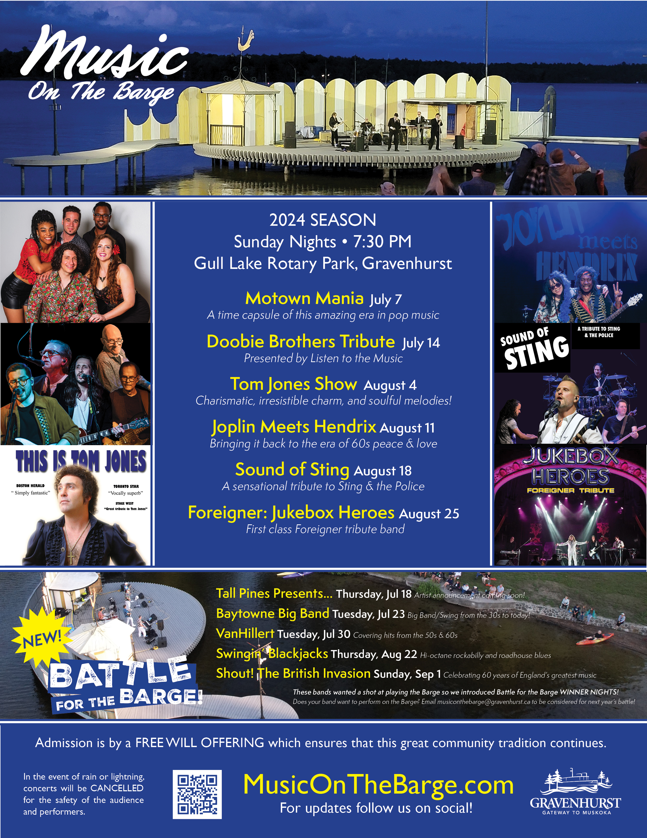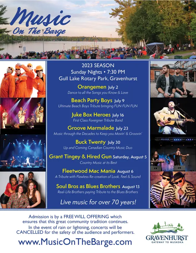 The Music on the Barge concert series is the largest outdoor concert series north of Toronto and draws thousands of seasonal and permanent residents to the shores of Gull Lake to enjoy a great evening of musical entertainment at this unique waterfront setting.